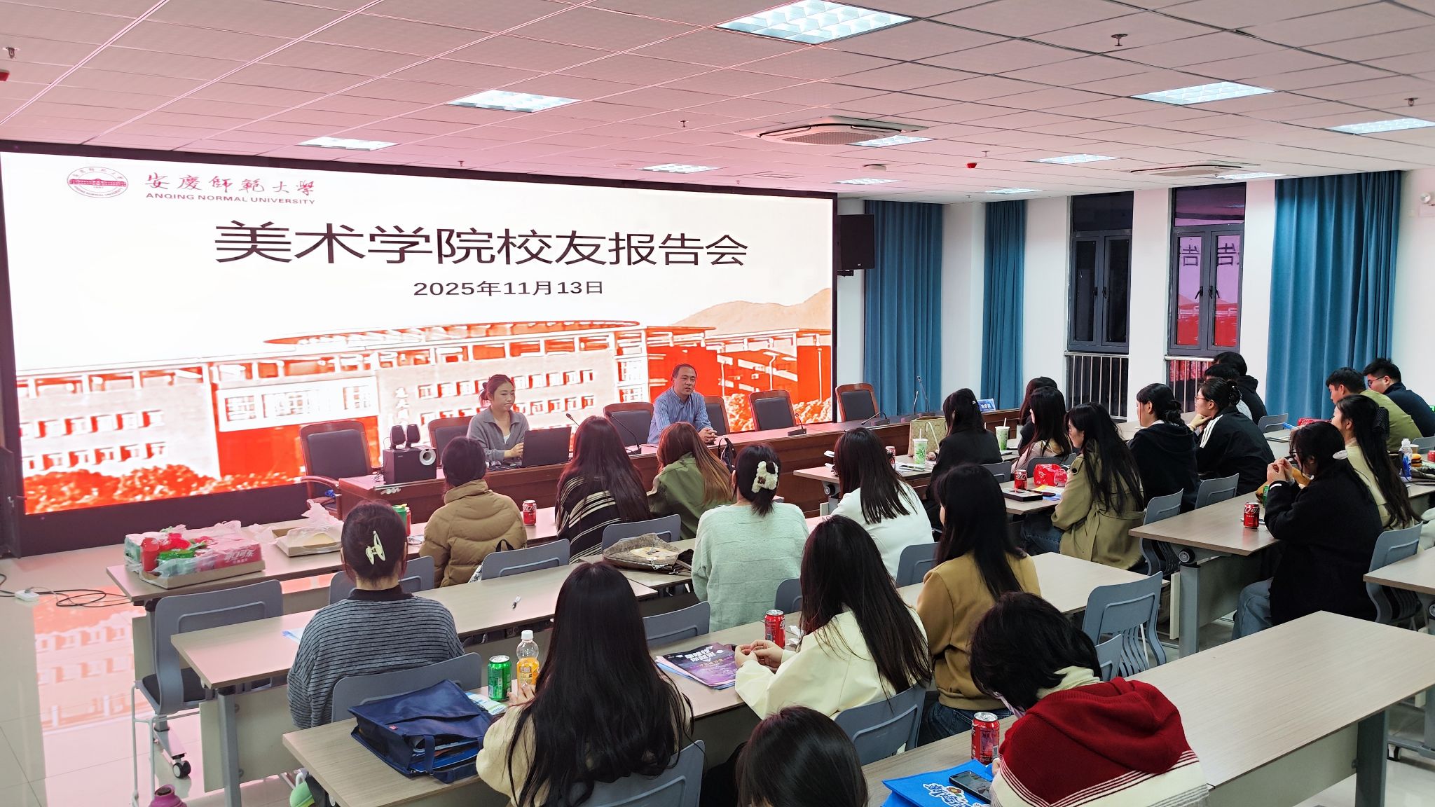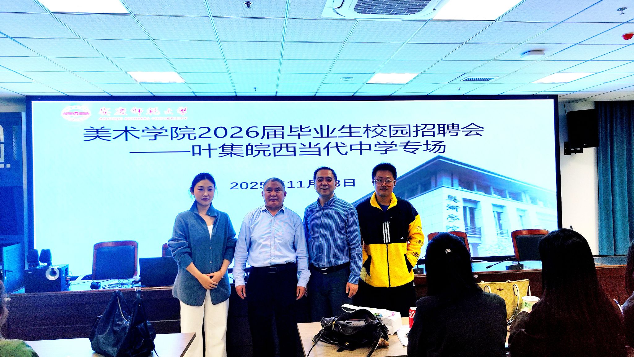 11月13日,美术学院邀请六安市叶集皖西当代中学校长郭世珍、艺术部副主任、美术学院2017届校友曹兴格,来院开展2026届毕业生校园专场招聘会暨校友报告会,美术学院党委副书记金忠良、毕业班辅导员、就业秘书和2026届毕业生参加了会议,会议由金忠良主持。