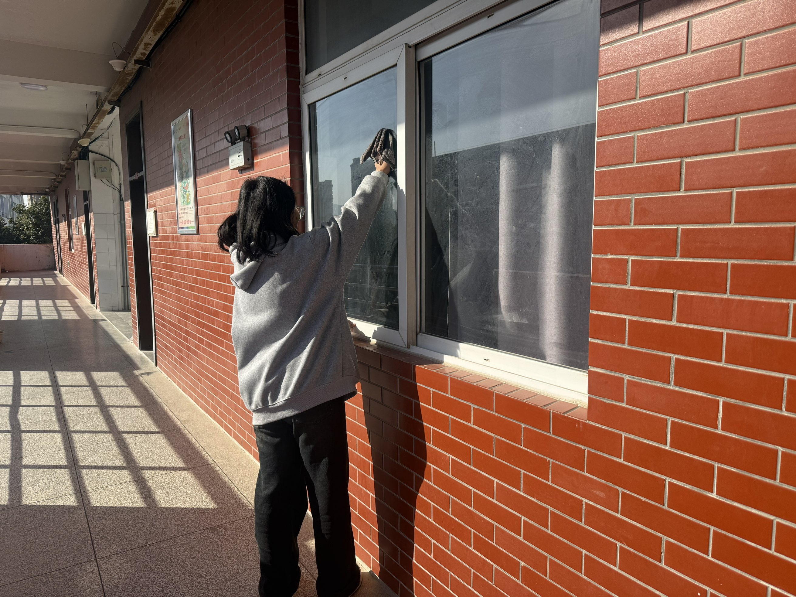 清洁过程中,同学们始终保持着认真负责的态度。“看着玻璃重新变得透亮,特别有成就感,同时也收获了劳动带来的快乐。”设计学专业2024(2)班孙思雅的开心溢于言表。在近两个半小时的劳动下,原本布满灰尘的窗户逐渐变得清澈透亮,当阳光透过洁净的玻璃洒进教室里,桌椅上木纹的纹路都被照得清晰透亮,每一位同学看着劳动的成果,深刻地体会到了劳动创造美的真谛。