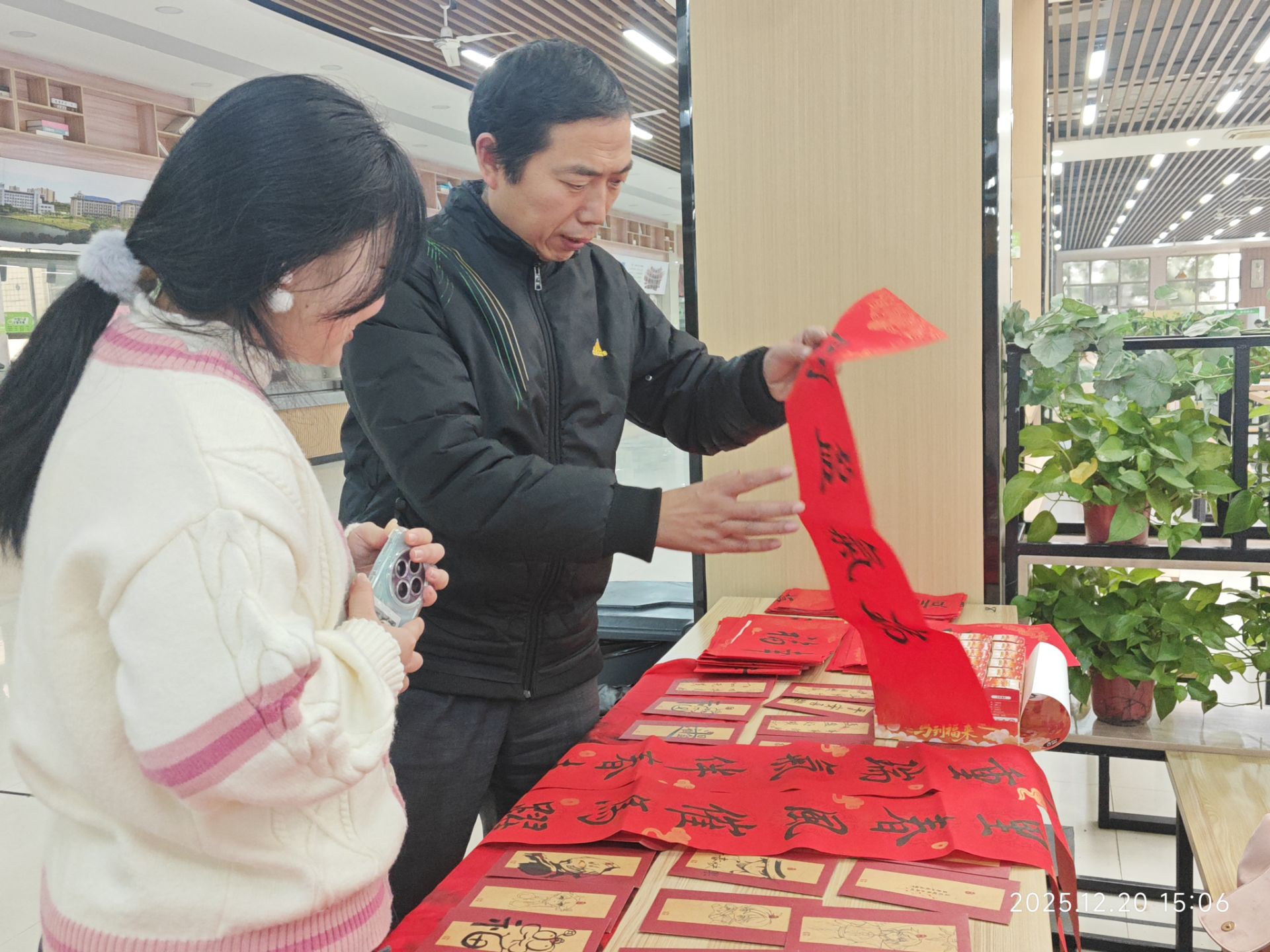 活动现场墨香氤氲,书法部成员挥毫泼墨,一幅幅笔力遒劲的春联与“福”字跃然纸上,红纸黑字间满溢新春暖意;绘画部成员亲手绘制的作品精巧别致,将传统民俗元素与青春创意巧妙融合。参与同学不仅能欣赏书画佳作,更可通过集赞兑换笔墨周边,在互动中感受中华优秀传统文化的鲜活魅力。