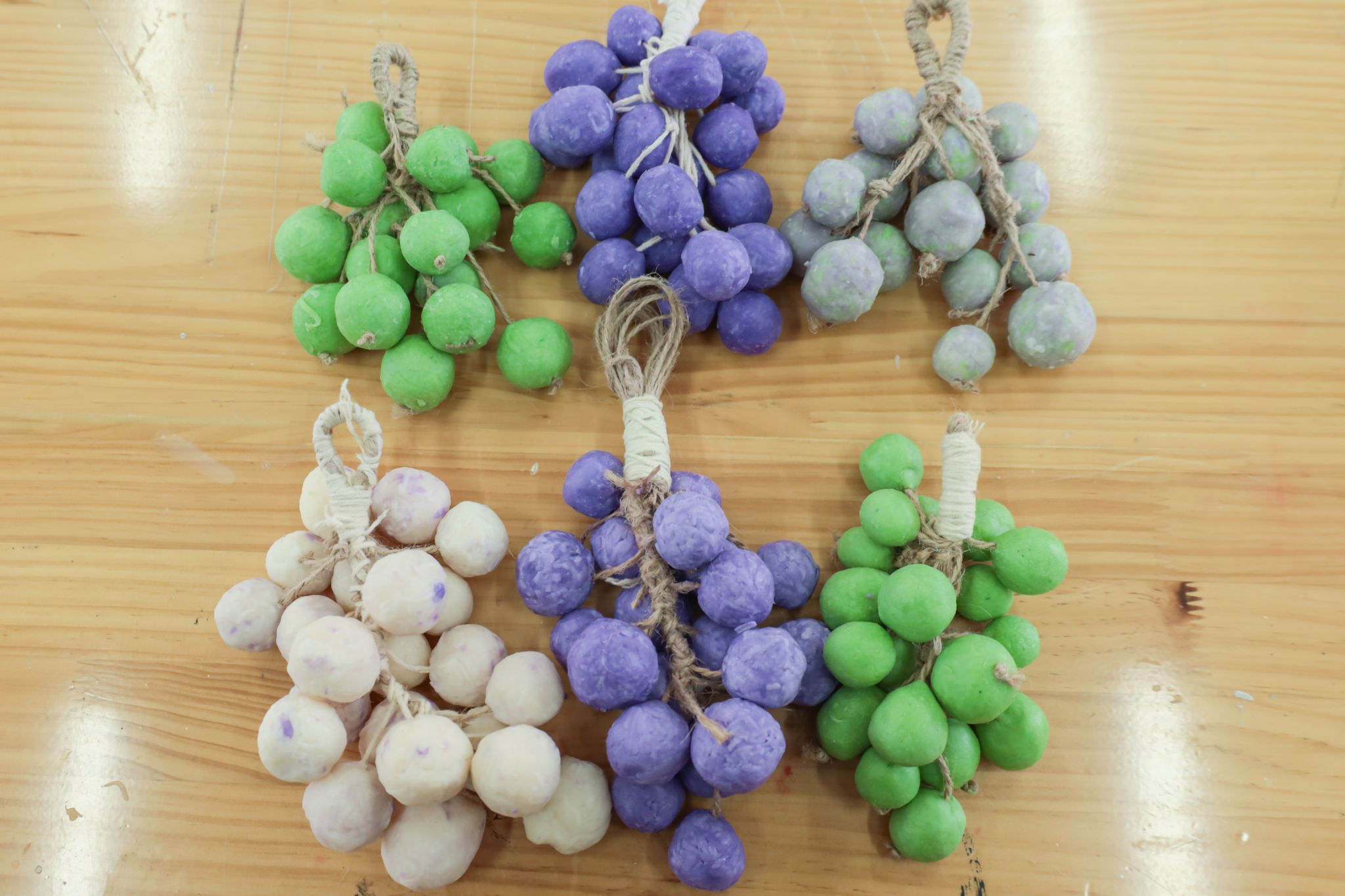 志愿者分组协作、各司其职,指尖的创意在皂泥上慢慢绽放。捏制葡萄造型皂时,有人俯身专注捏出圆润饱满的“小葡萄”,有人手持勾针将麻绳精准穿入皂块,有人手持剪刀裁剪麻绳、为穿好的皂块打上小巧的结。待一个个“小葡萄”串好,一人稳稳攥住所有麻绳让其垂直下坠保持整齐,另一人取麻绳紧紧捆绑成果梗,最后再仔细修剪掉多余麻绳,一串葡萄造型手工皂便成型。